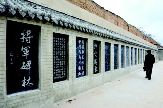 中岔古堡一堡三院,分為前院、中院、后院。走進(jìn)古堡,堡門(mén)左側(cè)建有戲樓,上書(shū)“中岔劇場(chǎng)”四字。戲樓(又稱戲臺(tái))始建于清光緒年間,上世紀(jì)六七十年代曾重修過(guò)。近堡門(mén)處右側(cè)堡墻下修建有兩處一體化的石碑長(zhǎng)廊一直通向后院,碑廊中石碑一塊接著一塊砌筑在青磚墻內(nèi),石碑與石碑之間以青磚分隔,上覆筒瓦和滴水防護(hù),每一通石碑上都刻有中華人民共和國(guó)將軍書(shū)寫(xiě)的一幅書(shū)法作品。第一通石碑上甘谷籍將軍張臣剛書(shū)寫(xiě)的“將軍碑林”四字分外醒目,劉精松、邢世忠、裴懷亮、李乾元等數(shù)十位叱咤風(fēng)云的共和國(guó)將軍書(shū)寫(xiě)的書(shū)法碑刻依次嵌進(jìn)墻內(nèi),組成一個(gè)氣勢(shì)磅礴、雄偉壯觀的將軍書(shū)法長(zhǎng)廊,這就是新建的將軍碑林。