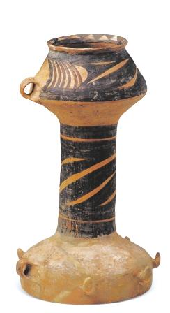 弦紋彩陶鼓 馬家窯文化馬家窯類型(距今約4800年),永登縣出土。這是一只陶鼓,鼓的兩端各有一耳,用于系繩,一端為喇叭口,另一端為罐形口,喇叭口外有六個爪突,用于固定鼓面。想必是用緊繃的獸皮做鼓面,這應(yīng)是腰鼓的雛形,是迄今為止發(fā)現(xiàn)時代最早的打擊樂器。