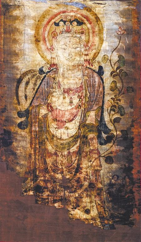 此像雖然褪色嚴(yán)重,殘缺不全,卻是敦煌絹畫中極為精美的佳作。觀音菩薩面朝前方,腰肢微扭,左肩前傾。面部輪廓清晰雅致,大耳垂肩,雙目微斂,神態(tài)慈悲安詳。右手持柳枝,左手提凈瓶,彎曲的長(zhǎng)莖從瓶口伸出,蓮莖與觀音的站姿相呼應(yīng),搖曳向上在左肩上方開出一朵含苞紅蓮。畫面右下方跪有持蓮花女供養(yǎng)人像二身,她們衣著發(fā)型簡(jiǎn)樸。其邊緣和畫面下部缺損嚴(yán)重,上部和兩側(cè)保存較完整,左上角長(zhǎng)方形榜題呈空白。整幅畫面造型柔美繁復(fù)、勾勒緊勁嚴(yán)謹(jǐn),衣帶翻轉(zhuǎn)飄舞,線條行云流水,疏密有致,加之斑斕的色彩,令畫面熠熠生輝。