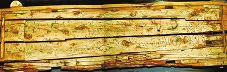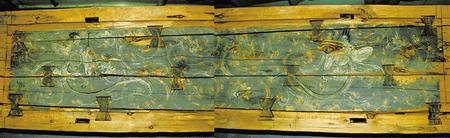 1998年新城魏晉南墓出土。這副完整的木棺由棺身和棺蓋組成,棺蓋內(nèi)側(cè)有一長(zhǎng)方形凹面,內(nèi)彩繪伏羲女媧圖。伏羲女媧人首蛇身,兩尾相交,伏羲在右,左手執(zhí)矩,女媧在左,右手執(zhí)規(guī)。伏羲女媧周圍飾云氣紋。棺身呈長(zhǎng)方體,兩檔頭用墨線勾畫星象圖,棺內(nèi)側(cè)四壁彩繪幃帳、絹帛、蠶繭等圖形。