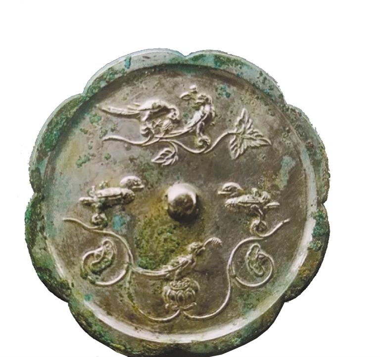 隋唐時(shí)期是中國(guó)封建政治經(jīng)濟(jì)文化高度發(fā)展繁榮的時(shí)期,唐代社會(huì)經(jīng)濟(jì)全面發(fā)展,手工業(yè)各部門也都興旺發(fā)達(dá),青銅鑄造業(yè)中的銅鏡業(yè)尤為突出,無(wú)論造型、題材、紋飾、鑄造工藝,都突破了前代的模式,達(dá)到了中國(guó)古代銅鏡藝術(shù)的巔峰。唐鏡鏡型厚實(shí),方形鏡、菱花形鏡、葵花形鏡流行;紋飾題材多見瑞獸、飛鳥以及葡萄、花草等;瑞獸葡萄鏡最具特色,是中西文化融合的杰作。