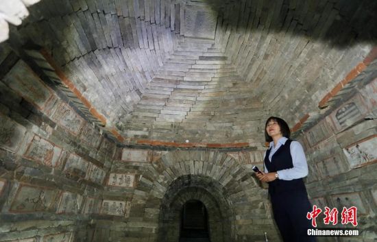 位于甘肅嘉峪關(guān)市的嘉峪關(guān)新城魏晉墓群,內(nèi)有千余座魏晉古墓,從1972年起,先后發(fā)掘18座,其中9座為畫像磚墓。磚壁畫取材于現(xiàn)實(shí)生活,用連環(huán)畫的方式反映出了當(dāng)時(shí)河西地區(qū)生活、生產(chǎn)、軍事、文化的真實(shí)情景,具有濃厚的生活氣息。目前只開放的六號(hào)墓,其壁畫內(nèi)容豐富,具有很強(qiáng)的代表性。高展 攝