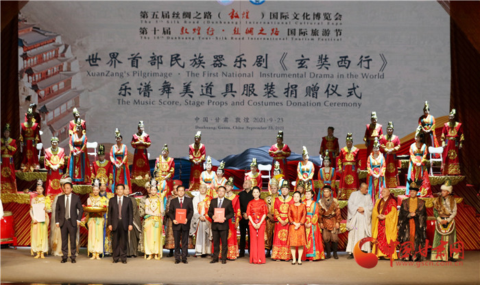 演出結束后,現(xiàn)場舉行了簡潔而隆重的“大型民族器樂劇《玄奘西行》樂譜舞美道具服裝捐贈儀式”,中央民族樂團將價值360萬元的樂譜、舞美、道具和服裝捐贈給甘肅演藝集團歌舞劇院,并指導甘肅省文藝院團將民族器樂劇《玄奘西行》打造成為弘揚絲路精神、推動絲路文化交流融合的經(jīng)典劇目。中央民族樂團作為海內(nèi)外規(guī)模最大、藝術最完備的綜合性國家級民族音樂表演團體,對甘肅文藝事業(yè)和地方樂團創(chuàng)作發(fā)展和人才培養(yǎng)給予大力支持,為甘肅文藝事業(yè)發(fā)展做出了重大貢獻。