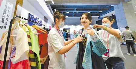 參觀者感受韓國傳統(tǒng)服飾。