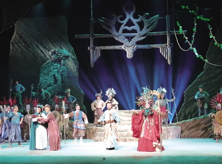 第三個步驟是大禹與土著山民首領山戎在強烈戲劇沖突中果斷地在改變自己的行為,并且以“忘我”的犧牲精神求得“天地之和,和在心中”的主旨意義。任何對自然生態(tài)的態(tài)度和沖突到頭來都集中體現(xiàn)在“人與人”的觀念習俗情仇恩怨的激烈紛爭之中。是故治水,也要“治理”自己的行為,升化自己的心智,以自己的真情坦露大愛, 甚或犧牲自己的性命。這就是“戲”的魅力。