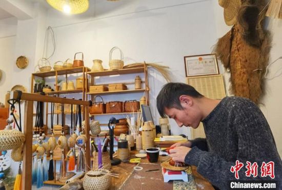 圖為承襲祖輩竹編手藝的“90后”張照杰正忙著趕制一件“私人訂制”的竹編手工品?!●T志軍 攝