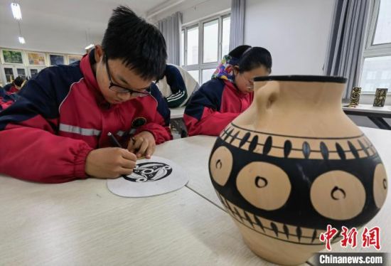 近日,中新社中新網(wǎng)記者走進(jìn)蘭州市第三中學(xué)“彩陶”課堂,學(xué)生正在繪制彩陶?qǐng)D案。 劉玉桃 攝