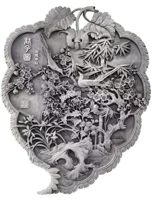 端詳沈占偉的作品,有栩栩如生的花鳥(niǎo),大氣磅礴的山川,活靈活現(xiàn)的人物,能想到的體裁應(yīng)有盡有??梢哉f(shuō)遠(yuǎn)看端莊大氣,近看細(xì)節(jié)精湛,尤其是對(duì)動(dòng)植物的刻畫(huà),仿佛通過(guò)他的刻刀賦予了生命,在原本冰冷的磚塊上呼之欲出,生機(jī)勃勃。難能可貴的是,他并不會(huì)限制自己的創(chuàng)作體裁,每一幅作品都是匠心之作,都傾盡了他的心血。