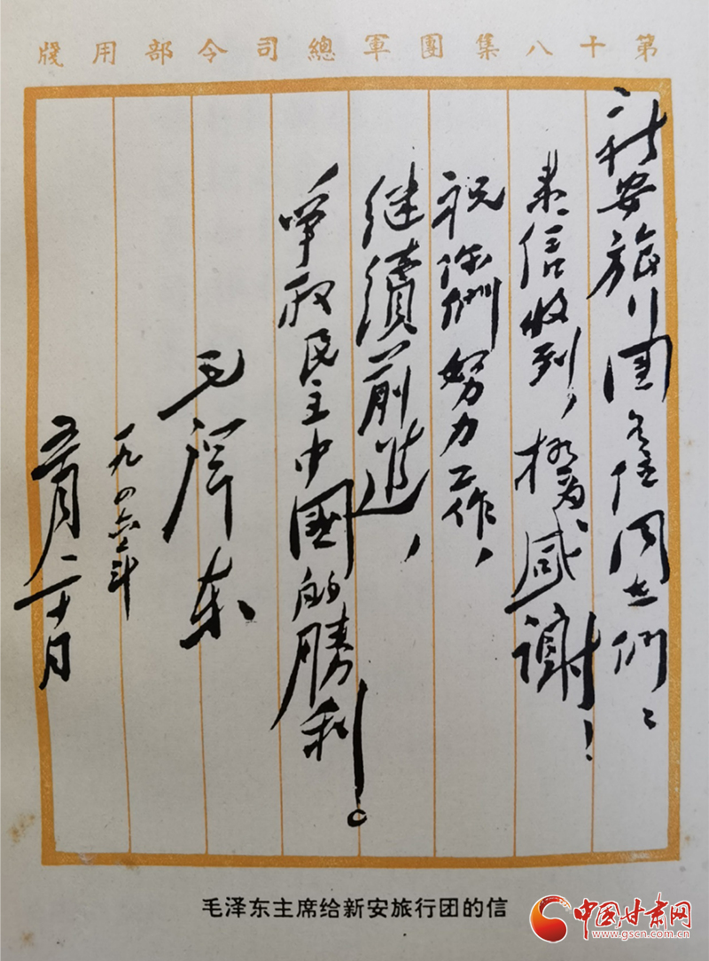 1946年5月20日,毛澤東主席給新旅回信:“新安旅行團(tuán)各位同志們:來信收到,極為感謝!祝你們努力工作,繼續(xù)前進(jìn),爭(zhēng)取民主中國(guó)的勝利。”時(shí)隔75年后的2021年5月30日,習(xí)近平總書記給新安小學(xué)的少先隊(duì)員們回信:“當(dāng)年,在黨的關(guān)懷和領(lǐng)導(dǎo)下,‘新安旅行團(tuán)’不怕艱苦,足跡遍及大半個(gè)中國(guó),以文藝為武器,喚起民眾抗日救亡,宣傳黨的主張,展現(xiàn)了愛國(guó)奮進(jìn)的精神風(fēng)貌。希望你們結(jié)合自身成長(zhǎng)實(shí)際學(xué)好黨史,以英雄模范人物為榜樣,從小堅(jiān)定聽黨話、跟黨走的決心,刻苦學(xué)習(xí),樹立理想,砥礪品格,增長(zhǎng)本領(lǐng),努力實(shí)現(xiàn)德智體美勞全面發(fā)展。”