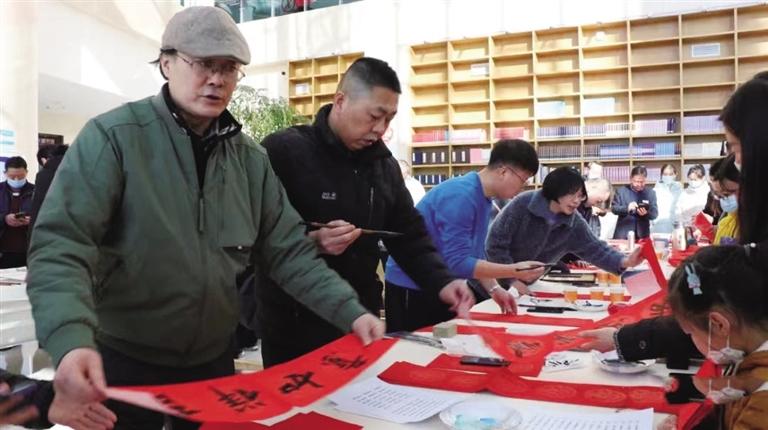 活動中,蘭州畫院和市文化館的10余位書畫家提筆蘸墨、盡情揮毫,為新區(qū)圖書館精心創(chuàng)作了美術作品,并為聞訊趕來的眾多新區(qū)居民現(xiàn)場書寫了寓意吉祥的春聯(lián)和“福”字近400套(幅),在春節(jié)來臨之際為他們送上了美好的祝愿。