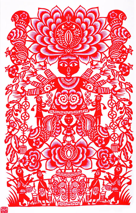 剪紙藝術(shù)題材多體現(xiàn)在祈福求安、避邪娛樂、孝道祭祀、喜事慶賀等等,例如五福娃娃、連年有余、大紅喜字、剪紙風(fēng)格也多樣化、多元化,剪紙作品一般初期主要是以對稱圖案為主,中后期主要發(fā)展成人物頭像、大型復(fù)雜圖案畫及反映和宣傳時(shí)代氣息的、人們喜聞樂見的多元素圖案,也將古代藝術(shù)和現(xiàn)代特征結(jié)合起來給人渲染一種藝術(shù)美、社會(huì)美、時(shí)代美的視覺欣賞、其作品妙趣橫生,秀美遒勁,雄渾大氣,喜聞樂見,愛不釋手,廣泛流傳在城鄉(xiāng)之間。當(dāng)下,剪紙藝術(shù)作為非物質(zhì)文化遺產(chǎn),深受社會(huì)各個(gè)階層的人士喜愛,把剪紙精神發(fā)揚(yáng)光大。傳承非遺,是我們共同的使命。