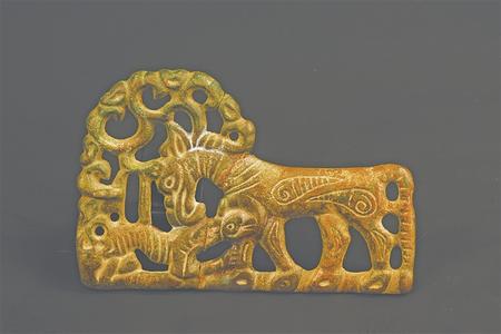 受草原文化影響,虎的造型更具藝術(shù)性,形式亦豐富多彩。甘肅省博物館藏的西周虎紋耳形銅鉞,整體似半環(huán),鑄猛虎紋,虎背為刃。尾下有短胡兩穿,尾、雙爪上鑄凹槽,虎首下彎,張口含銎,露牙睜目,領(lǐng)內(nèi)有一圓形穿孔。甘肅省文物考古研究所藏的戰(zhàn)國金帶鉤,鉤首為長頸龍首狀,頸部為三棱狀,肩部三角形邊框內(nèi)鏤空雕鑄對稱和狼形圖案。鉤身為長方形,邊框內(nèi)鏤空雕刻一組正反相對稱的虎噬大角羊圖案。張家川回族自治縣博物館藏的戰(zhàn)國晚期的虎形金飾片,虎尖耳上翹,大嘴張開,鬃毛卷曲上翹,尾前卷于背部與鬃毛相連,四足著地做行走狀,栩栩如生地展現(xiàn)了虎行走的動感之態(tài)。甘肅省博物館藏的戰(zhàn)國虎噬羊紋金飾片,虎張口露齒,垂首蹲踞,虎口銜羊,前爪按住羊肩部,后爪抓住羊臀部,羊四肢跪地作掙扎狀,活靈活現(xiàn)地展現(xiàn)出猛虎捕食羊的瞬間動態(tài),形象逼真。這些虎文物都是此次展覽中的亮點。
