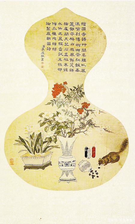 元代的《歲朝圖》中在瓶梅和水仙盆景前,描繪了一只偷堅(jiān)果的小松鼠,貯果的瓷瓶被打翻,瓜子灑了一地,旁邊還有兩顆打滾的核桃。