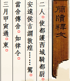 木簡1枚(出土編號:Ⅱ90DXT0213③:135),1990年出土于敦煌懸泉置遺址。長7.2、寬1.3、厚0.25厘米。木簡上殘,兩行書寫,字跡模糊,難以辨識。簡文作“二人。使都護西域騎都尉、安遠侯吉謂敦煌……駕,當舍傳舍,如律令。三月甲寅過,東。”。簡中“使都護西域騎都尉”是西域都護的正式官名,“騎都尉”當指以本官都護西域,是其本職,而“使”則突出了使職性質(zhì)。這是懸泉置記錄的一份傳文書,簡文不完整,大意是說某年三月甲寅日,西域都護鄭吉派遣的使者自西向東行,懸泉置依傳律規(guī)定,為停駐的兩名使者提供了飲食。該簡文對研究懸泉置的傳舍制度,以及西漢王朝對西域行使管轄提供了重要的原始資料?,F(xiàn)藏甘肅簡牘博物館。