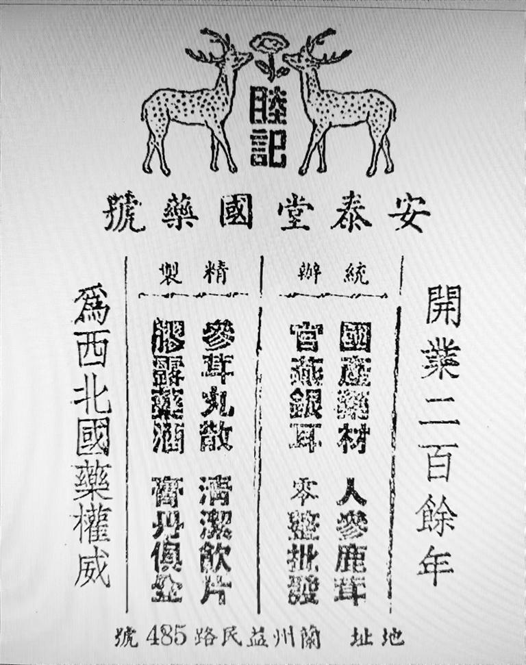 安泰堂作為百年老店,其廣告詞自然頗具氣場(chǎng)。首先明確定位:“開(kāi)業(yè)二百余年、為西北國(guó)藥權(quán)威”,其次是統(tǒng)辦“國(guó)產(chǎn)藥材、人參鹿茸,官燕銀耳、零整批發(fā)”,最后是本店特色,精制“參茸丸散、清潔飲片,膠露藥酒、膏丹俱全”。