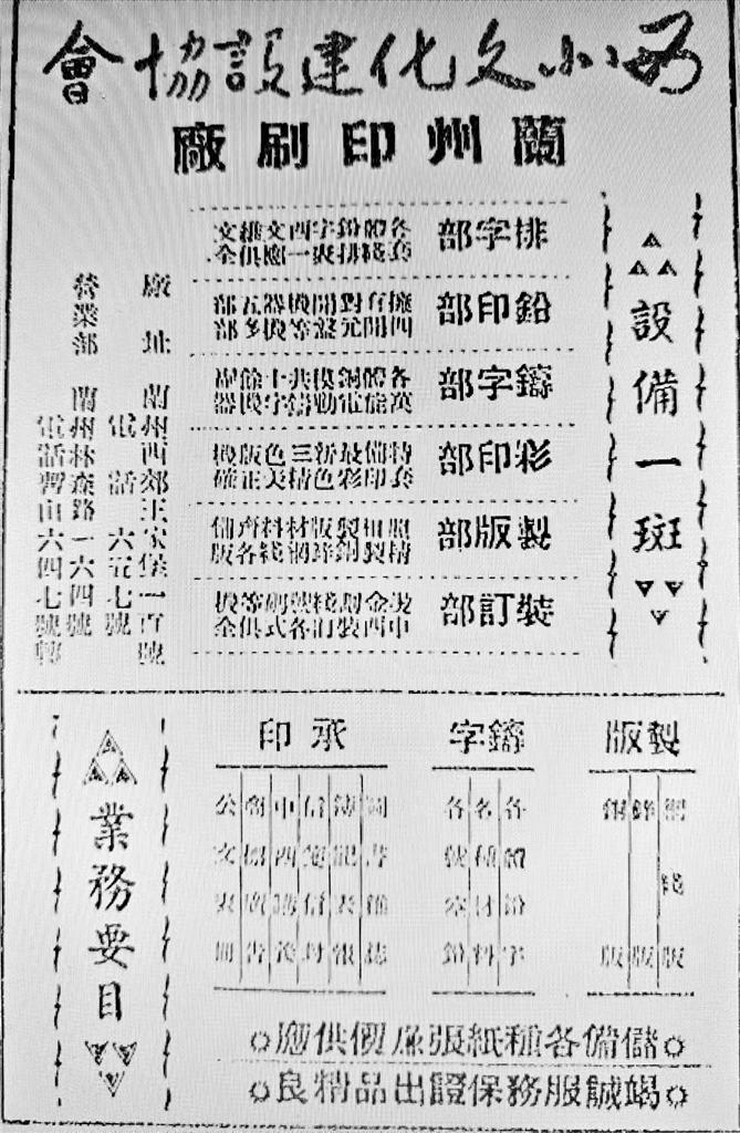 個(gè)別有實(shí)力的印刷廠也通過(guò)廣告拓展業(yè)務(wù)。如創(chuàng)辦于1947年9月的西北文化建設(shè)協(xié)會(huì)蘭州印刷廠是當(dāng)時(shí)甘肅規(guī)模較大的印刷廠之一,曾印制過(guò)《蘭州古今注》《花兒集》《西北論叢》《新光》等書(shū)刊。據(jù)當(dāng)年廣告所載,該廠內(nèi)設(shè)排字部、鉛印部、鑄字部、彩印部、制版部、裝訂部,承印范圍亦頗廣,包括圖書(shū)雜志、傳記表報(bào)、信箋信封、中西講義、商標(biāo)廣告、公文表格等。
