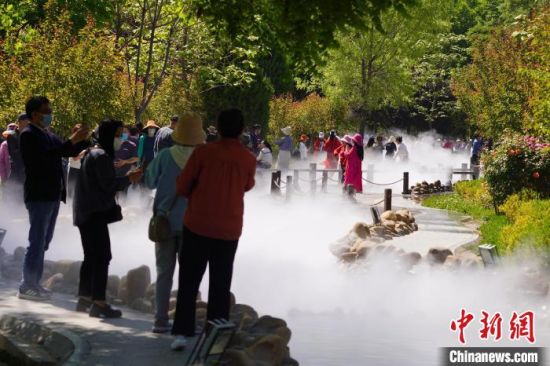 5月16日,甘肅蘭州,寓言故事園化身“瑤池”仙境美景,吸引不少市民前來(lái)觀賞、拍照?!【琶赖┰觥z