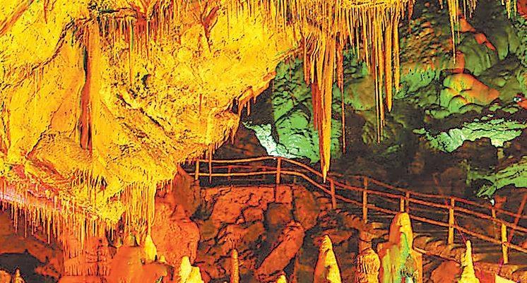 洞口低矮狹窄,感覺洞內(nèi)昏暗潮濕,深不可測。順著崎嶇不平的臺階,高一腳低一腳摸索著往前走了十幾步,忽然,眼前色彩繽紛,美輪美奐,這是何等美妙的仙境,各類石筍、鐘乳石、石柱像是午夜的森林,一下子占據(jù)了所有的視野。