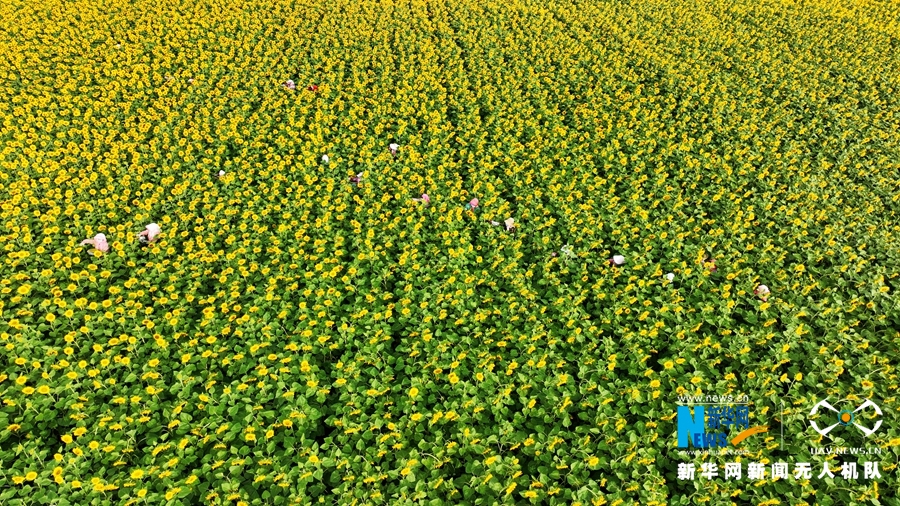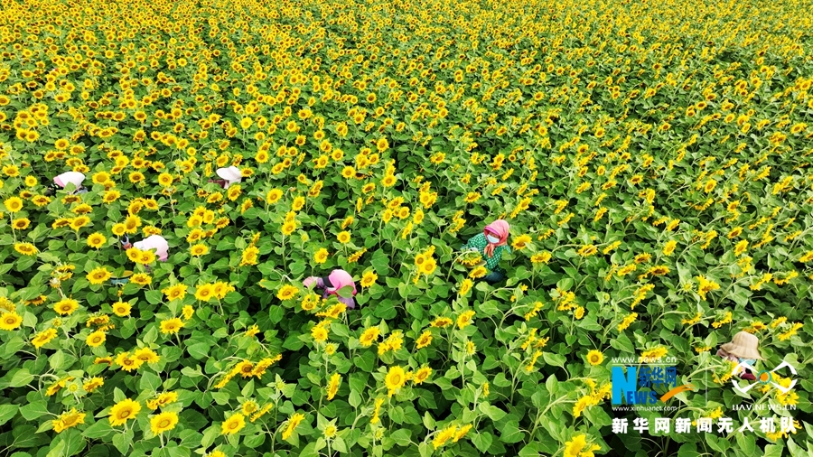 7月23日,甘肅省張掖市臨澤縣新華鎮(zhèn)長莊村近千畝制種向日葵盛開,金色花海里數(shù)十名葵農忙著為向日葵授粉。新華網(wǎng)發(fā)(成林 攝)
