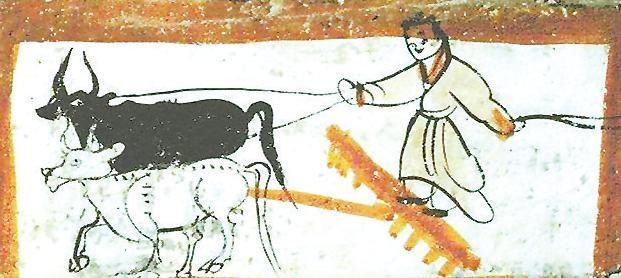 二牛抬杠圖 出自嘉峪關(guān)魏晉墓磚畫