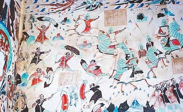 有些武器、軍需品的制作,技術(shù)含量很高?!妒鶉?guó)春秋·西涼錄》記載:建初二年(公元406年),西涼主李暠“造珠碧刀二口,銘其背曰‘百勝’,隸書。”珠碧,意為珠寶。這是在刀柄上鑲嵌珠寶,在刀背上用隸體鏤刻“百勝”二字的兩把刀,寓意百戰(zhàn)百勝。雖然記載未講刀的鋒利程度,但僅從其裝飾來(lái)看,殊非一般技術(shù)所能勝任。敦煌莫高窟第285窟南壁西魏壁畫《五百?gòu)?qiáng)盜成佛因緣》中,有戟式雙刃陌刀、長(zhǎng)矛、環(huán)首刀、弓箭及盾的圖像,應(yīng)當(dāng)是現(xiàn)實(shí)社會(huì)所用武器的形象反映,有很高的技術(shù)研究?jī)r(jià)值。