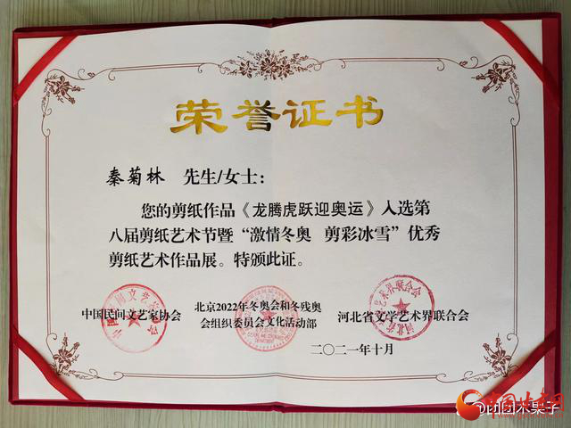 2021年11月由中國民間文藝家協(xié)會、河北省文學(xué)藝術(shù)界聯(lián)合會主辦,河北省民間文藝家協(xié)會、中共蔚縣人民政府承辦的“第八屆剪紙藝術(shù)節(jié)暨激情冬奧.剪彩冰雪”優(yōu)秀剪紙藝術(shù)大賽中,剪紙作品《龍騰虎躍迎奧運》榮獲優(yōu)秀收藏作品同時被河北省蔚縣博物館永久收藏,并頒發(fā)收藏證書。