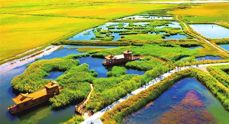 酒泉六分濕地景區(qū)是西北干旱荒漠區(qū)彌足珍貴的自然資源,也是重要的候鳥遷徙通道和停歇地。景區(qū)內(nèi)草長鶯飛,綠樹成蔭,蘆葦、香蒲連綿不絕,濕地坑塘星羅棋布,觀光棧道、亭臺樓閣便于賞景,春來踏青夏避暑,秋來賞景冬納雪,吸引了不少游客前來打卡。