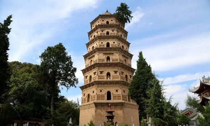 走上塔院,一眼就可以看到,造型為七級八角空心樓閣式,有南向拱門,門上一邊的層檐有浮雕三層斗拱,角吊垂于檐下,于風(fēng)中作擺。塔角雕刻著精美的佛像及浮雕。
