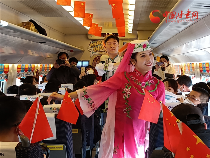 飛天與花兒相擁,甘肅與寧夏直通。蘭銀高鐵中蘭段開通,也讓銀蘭高鐵全線貫通。為了慶祝這一歷史時(shí)刻,D9058次列車乘務(wù)組準(zhǔn)備了精彩的節(jié)日?!痘▋号c少年》展演寧夏風(fēng)情,遇見塞上花開。敦煌樂舞,充滿甘肅元素講述飛天故事,巧妙的節(jié)目安排生動地展示了甘肅、寧夏兩省區(qū)的文化元素,讓旅途不僅有一路風(fēng)光,更有一路風(fēng)情。
