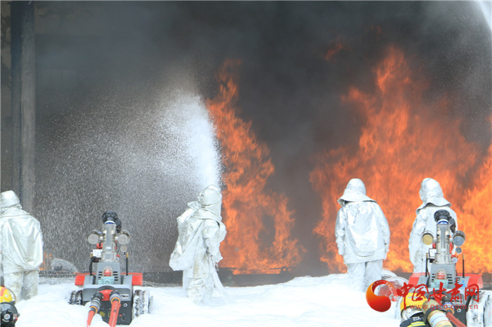 現(xiàn)場,爆炸聲浪一波未平,一波又起,黑煙滾滾夾雜火苗亂竄。在嚴(yán)峻考驗面前,消防隊伍采用先進技術(shù)壓制火力,發(fā)起總攻。最大程度模擬真實火災(zāi)場景,達到應(yīng)對復(fù)雜火災(zāi)考驗的能力。