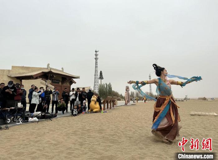 近年來,敦煌市委網信辦以“壁畫變裝秀”“飛天舞蹈短視頻”“漫說敦煌歷史”等形式,弘揚敦煌文化。6月以來,內地很多敦煌舞愛好者涌向敦煌,穿上以飛天服飾為代表的各種古裝,在絲綢之路旅游網紅“打卡地”鳴沙山月牙泉、玉門關、陽關等景區(qū)拍照、直播,各種不同的古裝服飾也為“大漠孤煙直”的絲路古道增添了無限色彩。