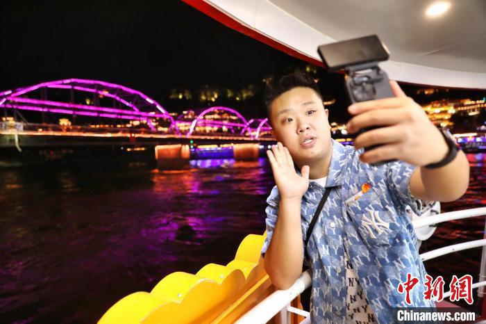 7月16日,“絲路風采 如意甘肅”海峽兩岸記者聯合采訪活動在甘肅蘭州啟動。圖為臺灣自媒體人林惟綱在“黃河第一橋”——中山橋下拍攝短視頻。 中新社記者 李雪峰 攝