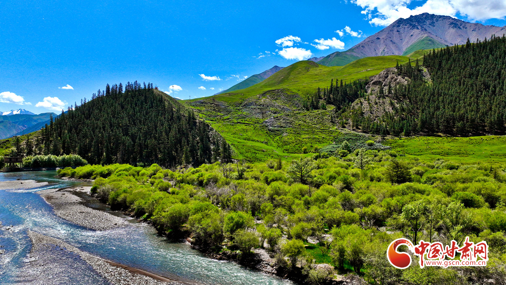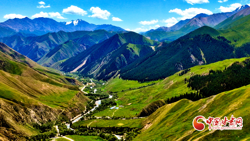 7月22日,祁連山國(guó)家公園甘肅省張掖市肅南裕固族自治縣大河鄉(xiāng)段,藍(lán)天白云下,巍峨壯麗的祁連山蒼松翠柏矗立其間,綠草如茵、水光粼粼,如同一幅壯美與秀麗并存的山水畫卷。