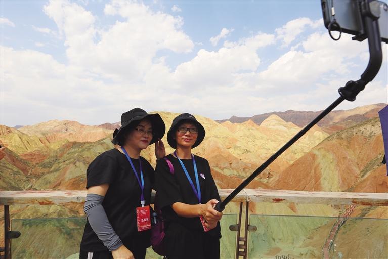 “這里綿延分布的彩色丘陵,好似與天際線融為了一體,勝似彩虹垂天。”王笑君是一名律師,平日里緊張忙碌的工作,總讓他不由自主有一種想逃離城市喧囂、回歸自然懷抱的愿望,機(jī)緣巧合之下他便選擇了水墨丹霞。他感慨地說:“真是挺難忘的,一眼望去,那五顏六色在陽光下濃烈的交織在一起,好似一幅無邊無際的潑墨山水,美不勝收。”