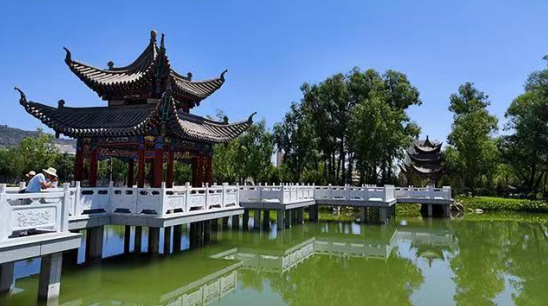 為景點命名。綜合考察廣河歷史文化遺存,細(xì)致視察公園營造之特色,遂將其命名為大夏公園,并結(jié)合園內(nèi)景點布局、建筑特色、用途等,為亭、榭、湖、軒、橋等景點命名,如齊家亭、半山亭、天保廊、鐘鼎山房等。最讓人心曠神怡處,當(dāng)為波光粼粼的湖面,因形狀頗似如意,故命名為如意湖,而分東西橫臥在湖面最狹窄處的兩座握橋,分別命名金龍橋、玉鳳橋。