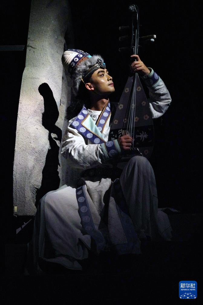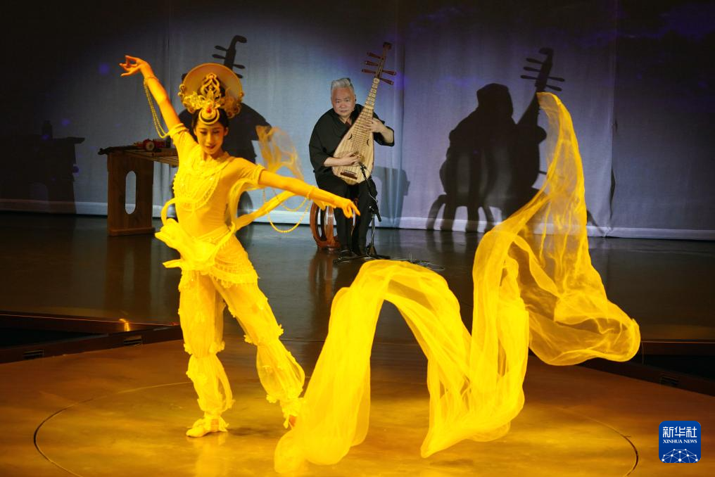 8月9日,在《樂動敦煌》演出現(xiàn)場,敦煌古樂全球推廣大使、國樂藝術家方錦龍演奏琵琶,為舞蹈演員伴奏。新華社記者 馬寧 攝