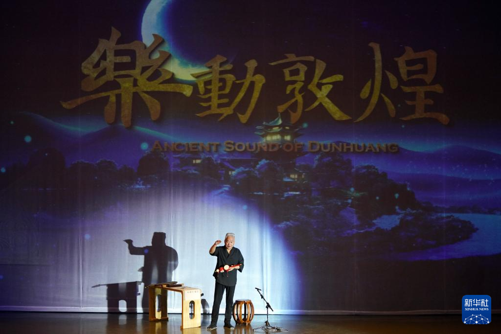 8月9日,在《樂動敦煌》演出現(xiàn)場,敦煌古樂全球推廣大使、國樂藝術家方錦龍在向觀眾介紹傳統(tǒng)音樂。新華社記者 馬寧 攝