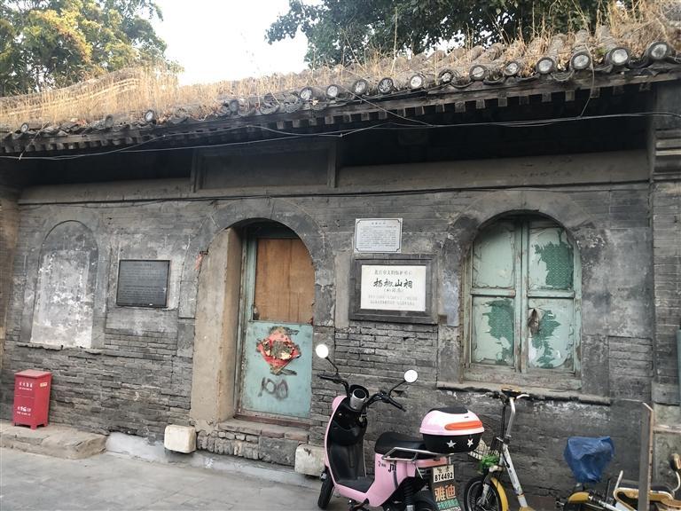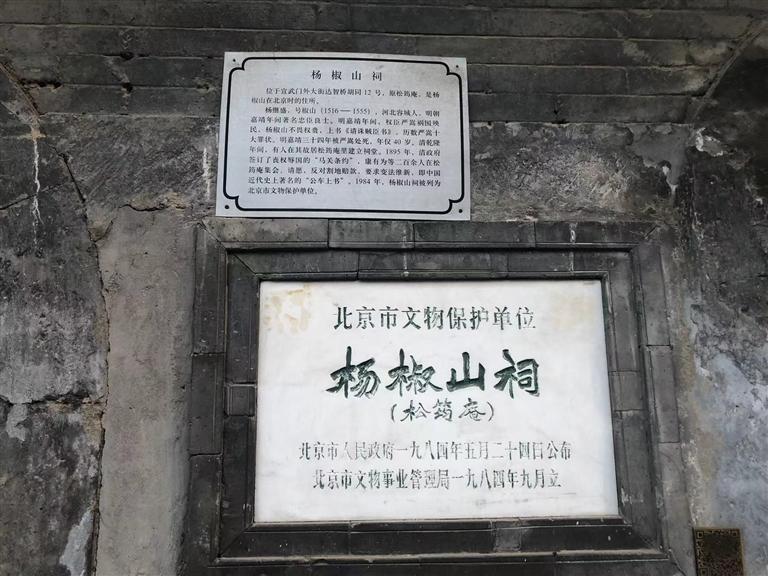 就是在這個(gè)胡同里,我看到一個(gè)歇山式屋頂?shù)姆课荩严喈?dāng)?shù)钠茢?,屋頂上長(zhǎng)滿了凄凄荒草,門窗皆已破爛不堪。但是門旁的墻壁上卻鑲嵌著一塊匾,近前一看,上面寫著“楊椒山祠”。喲,這就是楊椒山在北京的祠。