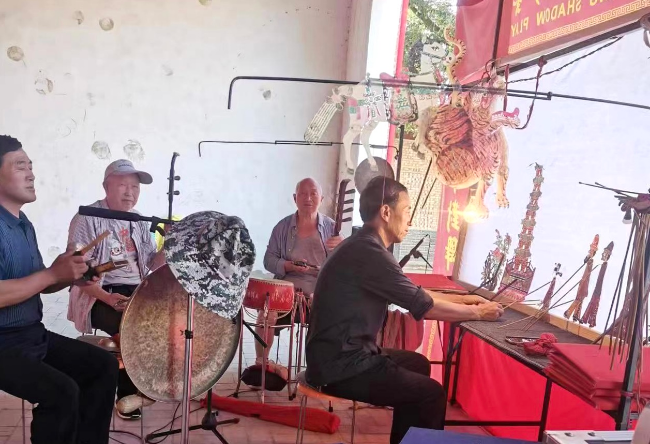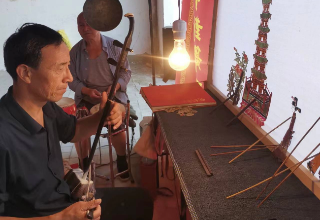 環(huán)縣道情皮影戲的價值主要體現(xiàn)在優(yōu)美獨特的道情音樂唱腔和精湛的皮影制作及表演上。戲班演出時,前臺一人挑扦表演,并承擔所有角色的坐唱念白,后臺四五人伴奏并“嘛簧”,一唱眾和,粗獷高亢,獨具風格。伴奏樂器中的四弦、漁鼓、甩梆子、簡板均為自制,音色獨特,傳唱劇目有180余部,至今還保留著“圖”“卷”等古老文化符號。