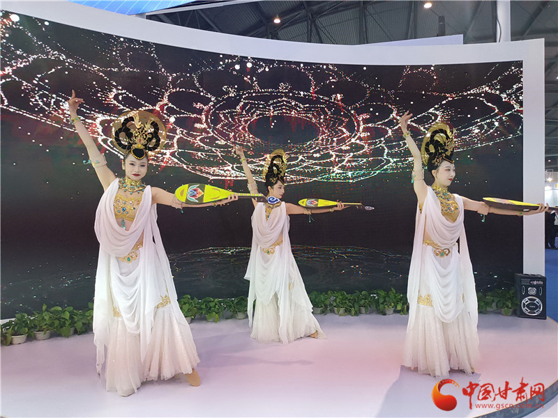 走進(jìn)甘肅特色版權(quán)館,敦煌文化元素濃郁。無論是展廳頂部的三兔共耳藻井,還是數(shù)字敦煌展區(qū)顯眼現(xiàn)代的四個(gè)大字,都在展示甘肅的敦煌元素。而展廳舞臺(tái)區(qū)更是以數(shù)字敦煌庫(kù)為背景,由舞蹈演員現(xiàn)場(chǎng)表演《妙音反彈》,讓觀眾走進(jìn)甘肅館,就能發(fā)現(xiàn)敦煌韻。