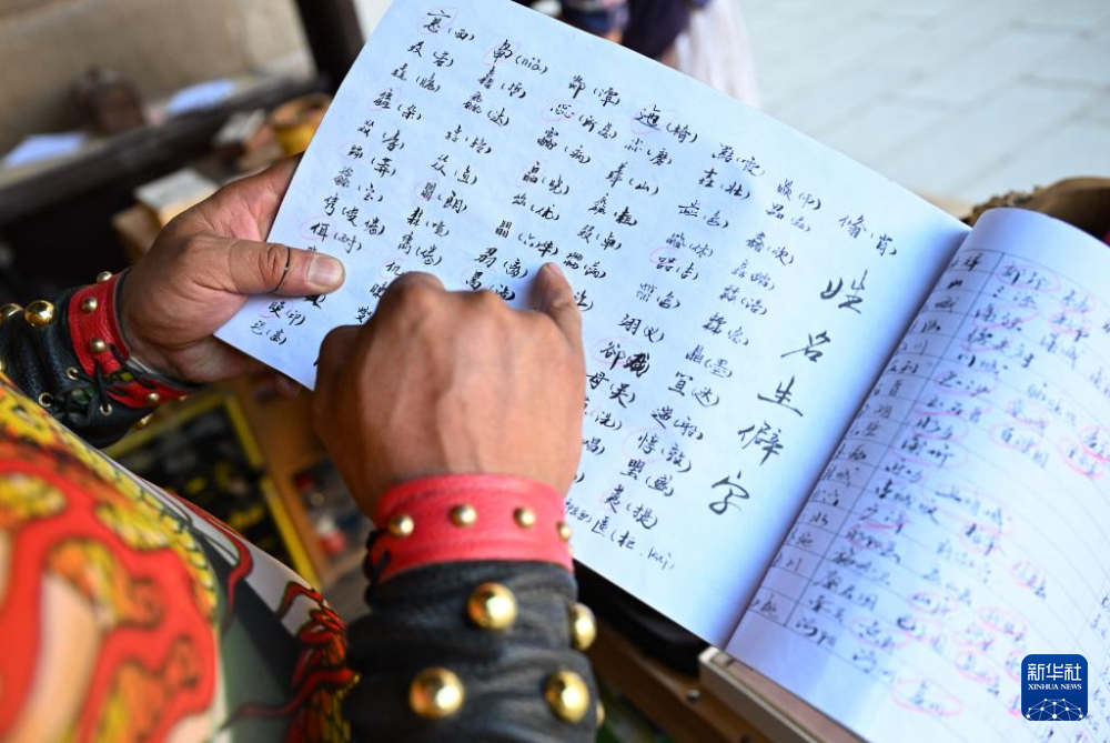 在甘肅嘉峪關(guān)關(guān)城景區(qū),李森在攤位上查閱自己編寫(xiě)的含有生僻字讀音、城市古地名等內(nèi)容的小冊(cè)子(7月14日攝)。新華社記者 陳鐘昊 攝
