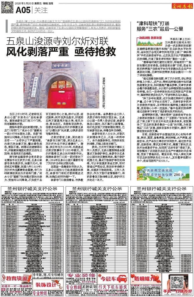 2020年3月20日《蘭州晨報》刊登呼吁搶救五泉山劉爾炘對聯(lián)的報道。