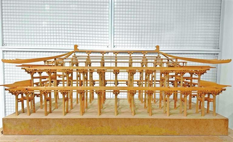 “這是兩個(gè)學(xué)生共同完成的,是按照大明宮含元殿的木制結(jié)構(gòu)圖制作的。”彭維新說。