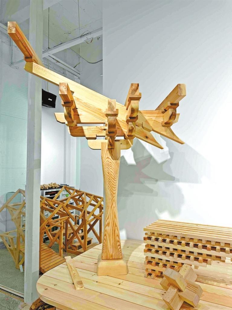 眼前,記者看到一件榫卯結(jié)構(gòu)的建筑作品氣勢(shì)不凡。
