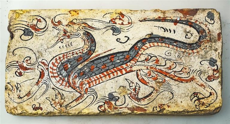 中國人恪守天人合一、陰陽平衡、五行生克的風(fēng)水理論,風(fēng)水中龍脈對人心理的影響深遠(yuǎn),使得龍在建筑裝飾、墓葬中普遍應(yīng)用,成為中國建筑裝飾藝術(shù)的瑰寶。隨著兩漢磚室墓的出現(xiàn)和流行,由星辰崇拜衍生而來的四靈形象,逐漸成為墓葬建筑裝飾的重要元素,如金昌市博物館藏的魏晉青龍磚,龍首高昂,龍須上揚(yáng),曲頸挺胸,張口吟嘯,前肢登騰,后肢做行進(jìn)狀,周圍環(huán)繞云氣紋,有隨云彩而飛動之感。