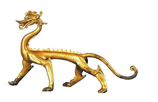 河南偃師的二里頭遺址出土了夏代龍文物,說明此時龍已經(jīng)成為身份、地位的象征。商代開始,龍的突出特征便是有了角,并多以夔龍紋等形象出現(xiàn)在青銅器上。春秋戰(zhàn)國時代是一個大變革、大發(fā)展的時代。與政治上諸侯爭雄、思想界百家爭鳴、陰陽學(xué)說盛行相適應(yīng),龍的圖案中出現(xiàn)了“群龍”和“交龍”形象。如甘肅省博物館收藏的戰(zhàn)國盤龍紋金飾片,兩條龍交叉盤繞,龍首一側(cè)飾兩條小龍,龍尾一側(cè)飾一對小虎,作咬噬龍尾狀,龍身上飾聯(lián)珠紋。隨著華夏大地結(jié)束戰(zhàn)亂,走向一統(tǒng),秦漢時代的龍出現(xiàn)相對規(guī)范和定型的趨勢,并出現(xiàn)了背上長翅膀的龍。魏晉南北朝時期龍形象對內(nèi)融合各少數(shù)民族文化,對外融合佛教文化,流行的龍紋頭部扁長,角似鹿角,發(fā)鬣后披,挺胸奮肢,呈現(xiàn)出矯健奔放、線條流暢、氣韻生動的特點。