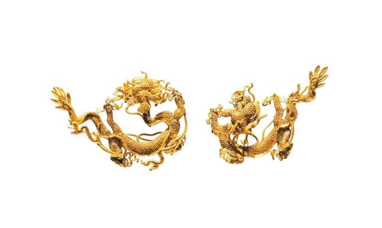 甘肅省博物館藏的明代累絲金龍,龍首聳額巨目,鬣發(fā)飛揚(yáng),神情兇猛;龍足屈伸相應(yīng),利爪如鉤;龍身似盤似舒,蜿蜒多態(tài);龍尾分叉,形狀如葉,輕輕擺動,飄帶般長須刻畫出金龍瀟灑自由的雄姿。