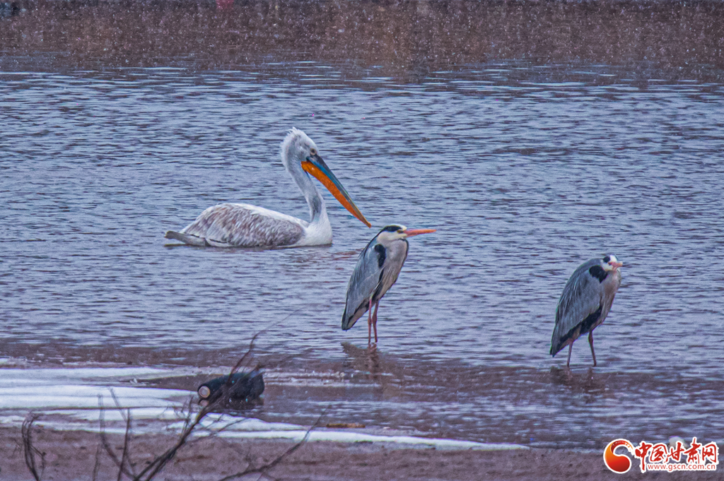 當(dāng)天,天空下著大雪,天氣寒冷,一位野生鳥(niǎo)類攝影愛(ài)好者驚喜地在崇信縣汭河段發(fā)現(xiàn)了一只卷羽鵜鶘盤(pán)旋于河道上空,經(jīng)過(guò)跟蹤其降落于發(fā)現(xiàn)地20里外的銅城水庫(kù)附近水域,與蒼鷺混群。