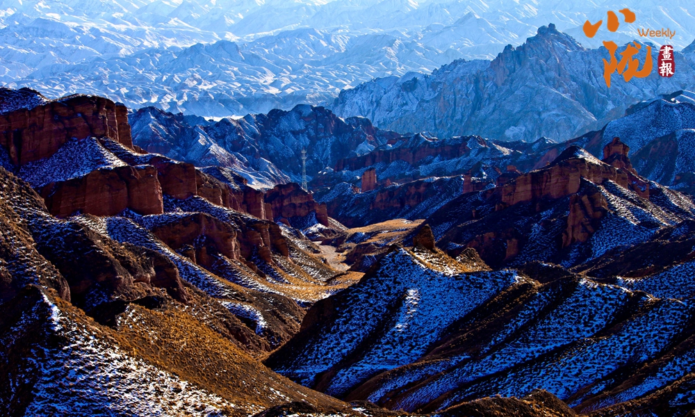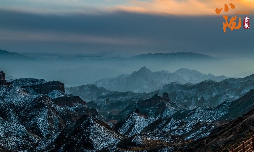 雪后,赤紅色的丘陵充滿陽(yáng)剛之美,白雪宛如輕紗浸在丹霞山上,顯得格外艷麗多彩、如夢(mèng)如幻。