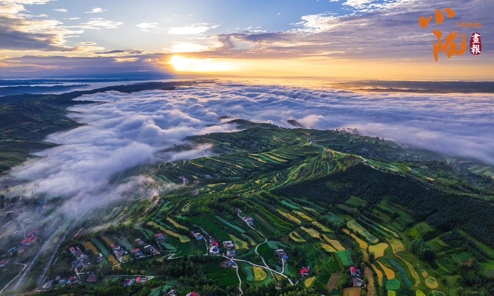 從高處俯瞰,白色的云海在大地上空翻騰涌動(dòng),時(shí)而聚攏,時(shí)而消散,田園、村莊在云霧中時(shí)隱時(shí)現(xiàn),如夢(mèng)如幻。